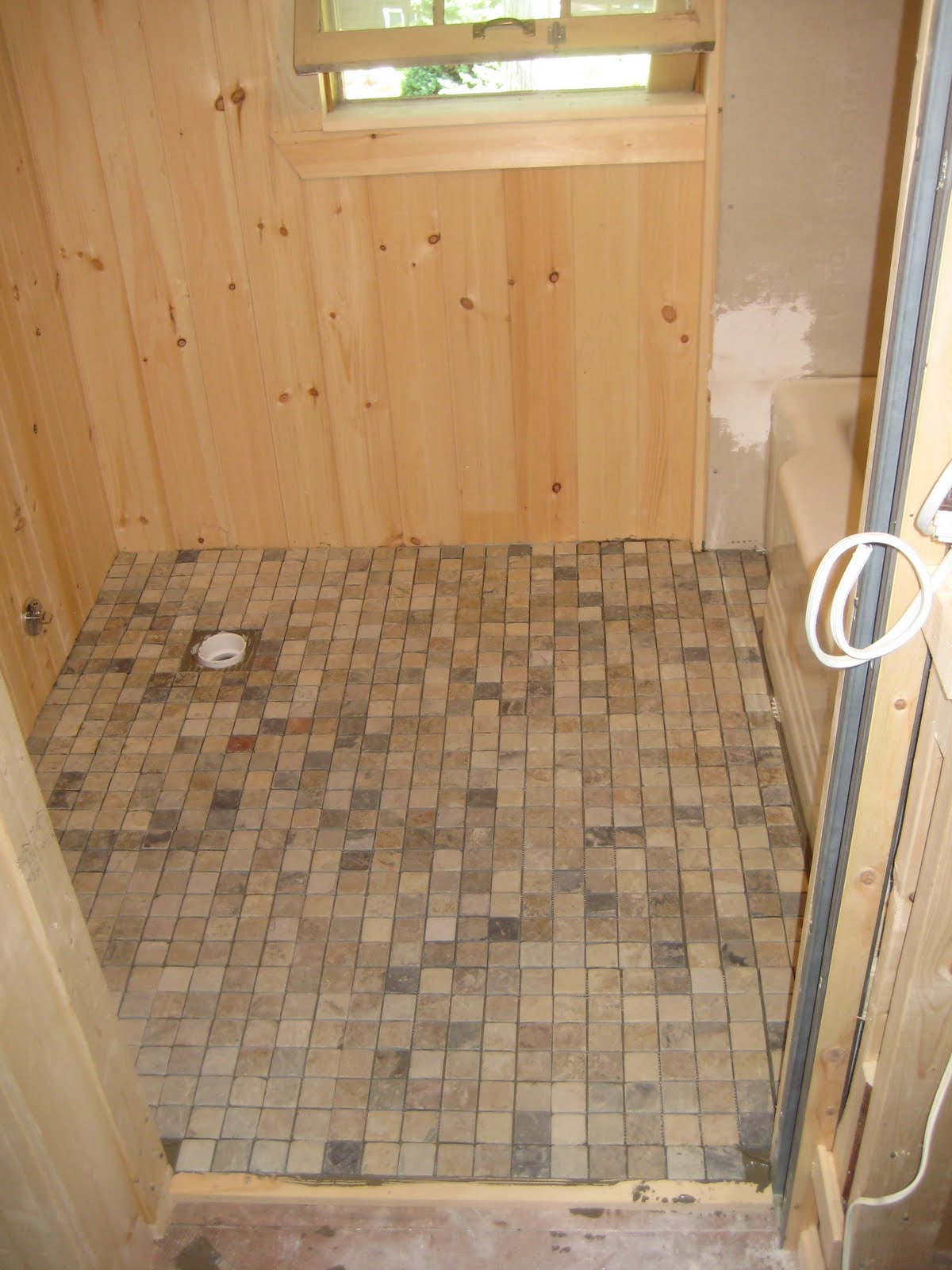 OK, so we mixed a bit too much thinset and decided to race against the clock and use it all...or rather Seth (no relation) did. He thought he'd have a leisurely day at the cottage and attempt to lay down one floor. Well, the slate on the first floor went down so easily that he thought he'd try the second floor, which went down even easier! He still had 2 gallons of thinset left, so he tiled the downstairs shower...it all looks awesome!